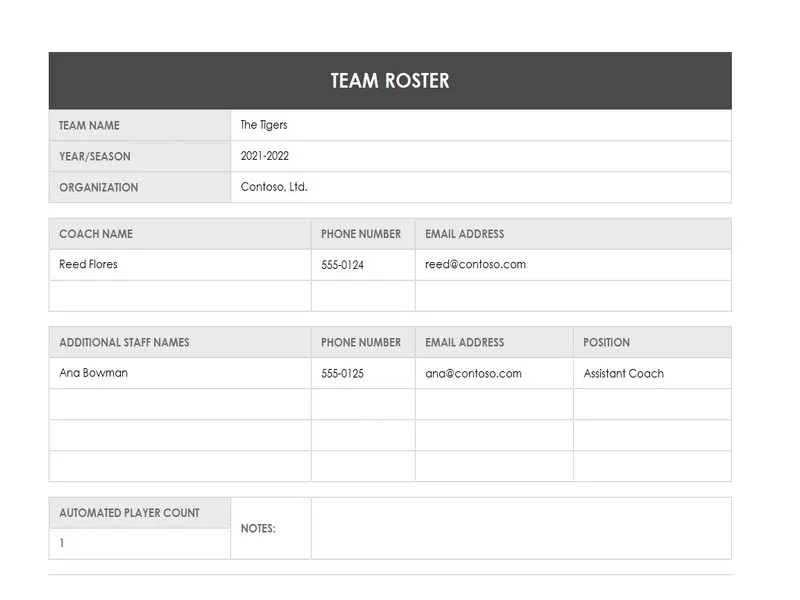 The easiest way to fill out the team roster template is to simply copy and paste the information into the Word file. Please note that when you do not specify a starting XI, the list of players who start for your team are the eleven players in the middle of the team roster template.